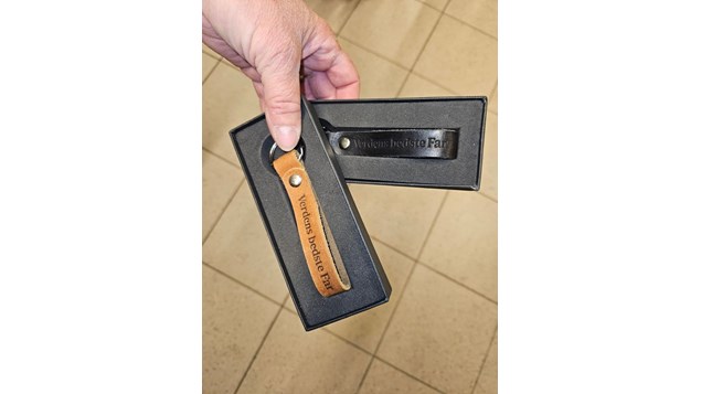 Billig nøglering i læder med teksten "Verdens bedste far" hos Rema 1000 på Gærumvej