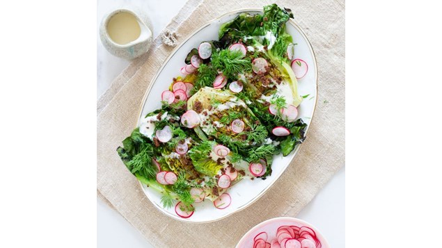 Tip! Prøv denne lækre anretning med grillet hjertesalat, radiser, mormordressing, dild og rugbrødsknas.