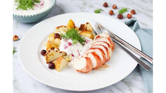 Kylling i svøb med bagte kartofler og blomkål. Hertil urtedressing (varer fra avisen: Kartofler, kyllingefilet)