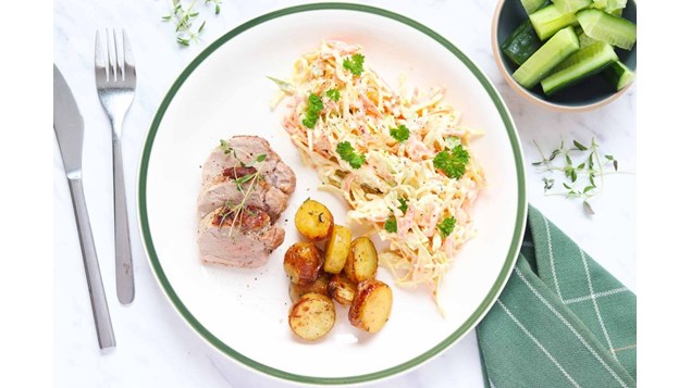 Mørbrad med kartofler, færdig coleslaw og agurkestave. Avisvarer: Svinemørbrad og færdig coleslaw