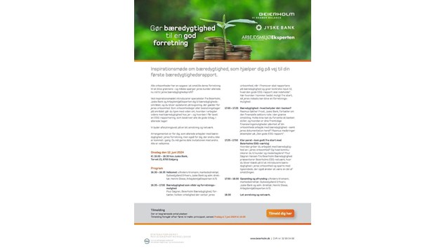 Sammen med eksperter fra Beierholm og Jyske Bank, vil vi give dig indsigt i relevant lovgivning og konkrete værktøjer til at arbejde videre med bæredygtighed i din virksomhed. Uanset om du er godt i gang eller lige er startet, får du værdifuld viden og netværksmuligheder.