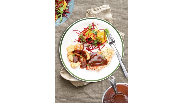 Kylling med ovnkartofler og rødbedesalat – serveret med brun sauce