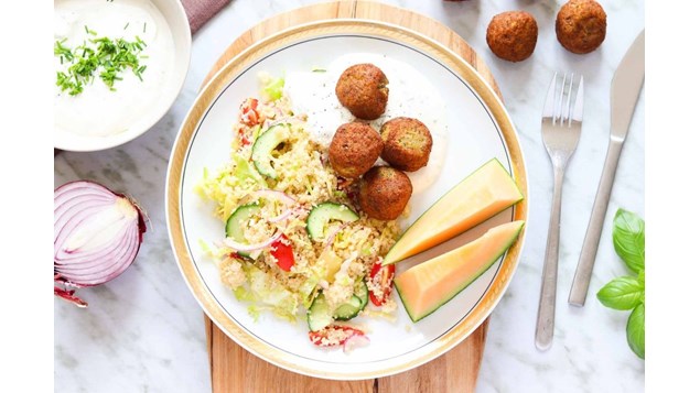 GRØN: Falafler med couscoussalat og melon. Hertil purløgsdressing (varer fra avisen: Falafler, spidskål, cherrytomater, cantaloupemelon).