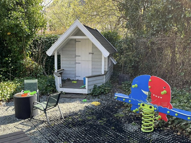 Her er der tænkt på de mindste gæster med både sandkasse, legehus og vippedyr. Det giver forældrene mulighed for at blive siddende lidt længere og nyde kaffen, mens børnene leger trygt i nærheden.