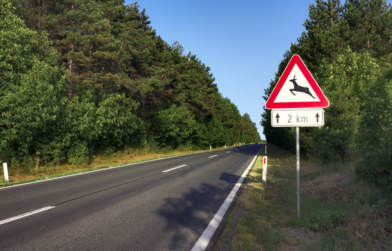 - Hvis der er skov eller anden natur på begge sider af vejen, er risikoen for at påkøre et dyr stor. Sæt farten ned, og skærp din opmærksomhed.