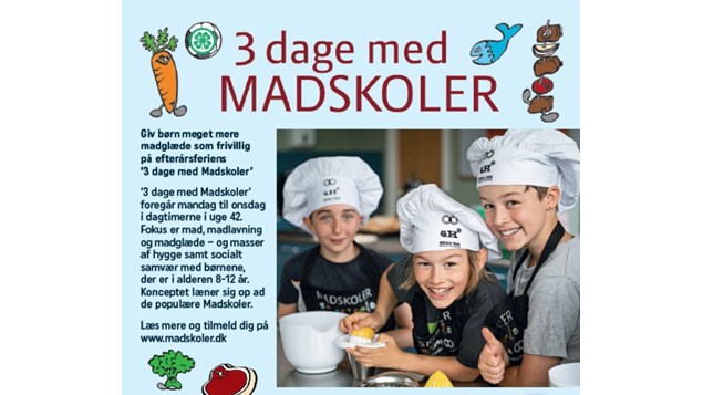 ’3 dage med Madskoler’ foregår mandag til onsdag i dagtimerne i uge 42. Fokus er mad, madlavning og madglæde – og masser af hygge samt socialt samvær med børnene, der er i alderen 8-12 år