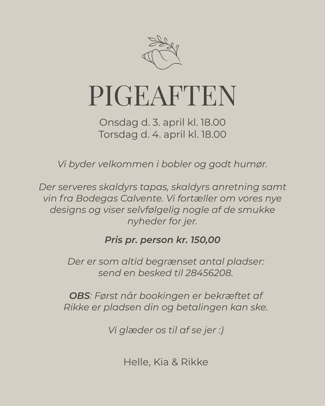 Skaldyrshuset inviterer igen til en eksklusiv pigeaften. Arrangementet finder sted onsdag den 3. april og torsdag den 4. april, begge dage kl. 18.00.