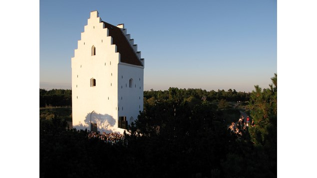 Stien breder sig ud og pludselig tårner kirken sig op foran os. Her gøres holdt, mens der fortælles om kirken, de fok, der har boet her gennem tiderne, koblet sammen med sandflugten. Det er en spændende historie, ikke mindst, da det hele starter med en uforklarlig klimaforandring (lille istid)